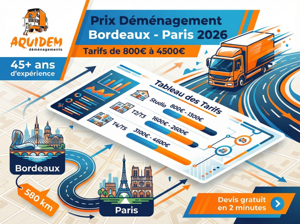 Le prix d’un déménagement entre Bordeaux et Paris se situe généralement entre 800 € et 4 500 € pour l’année 2026. Ce coût de votre déménagement varie principalement selon le volume total à transporter et la formule choisie. Pour un petit appartement de type studio (environ 10-15 m³), prévoyez un tarif indicatif de 800 € […]